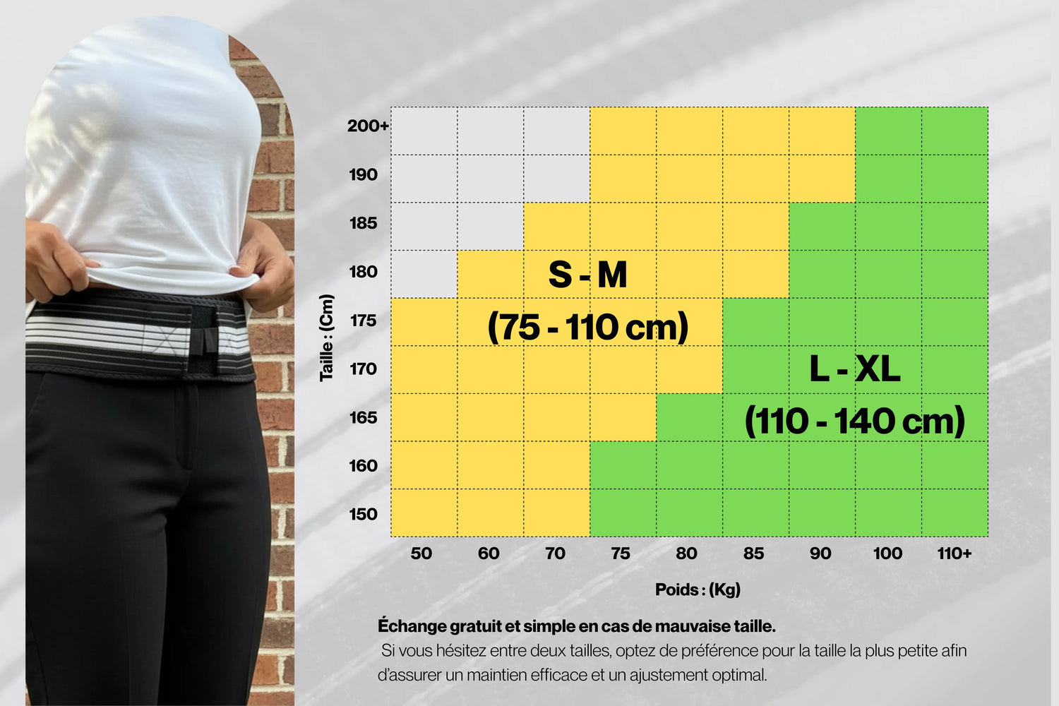 La ceinture doit être suffisamment ajustée pour soutenir le dos et offrir de la stabilité, mais elle ne doit jamais gêner la respiration ou le mouvement. Un maintien ferme mais confortable est idéal.